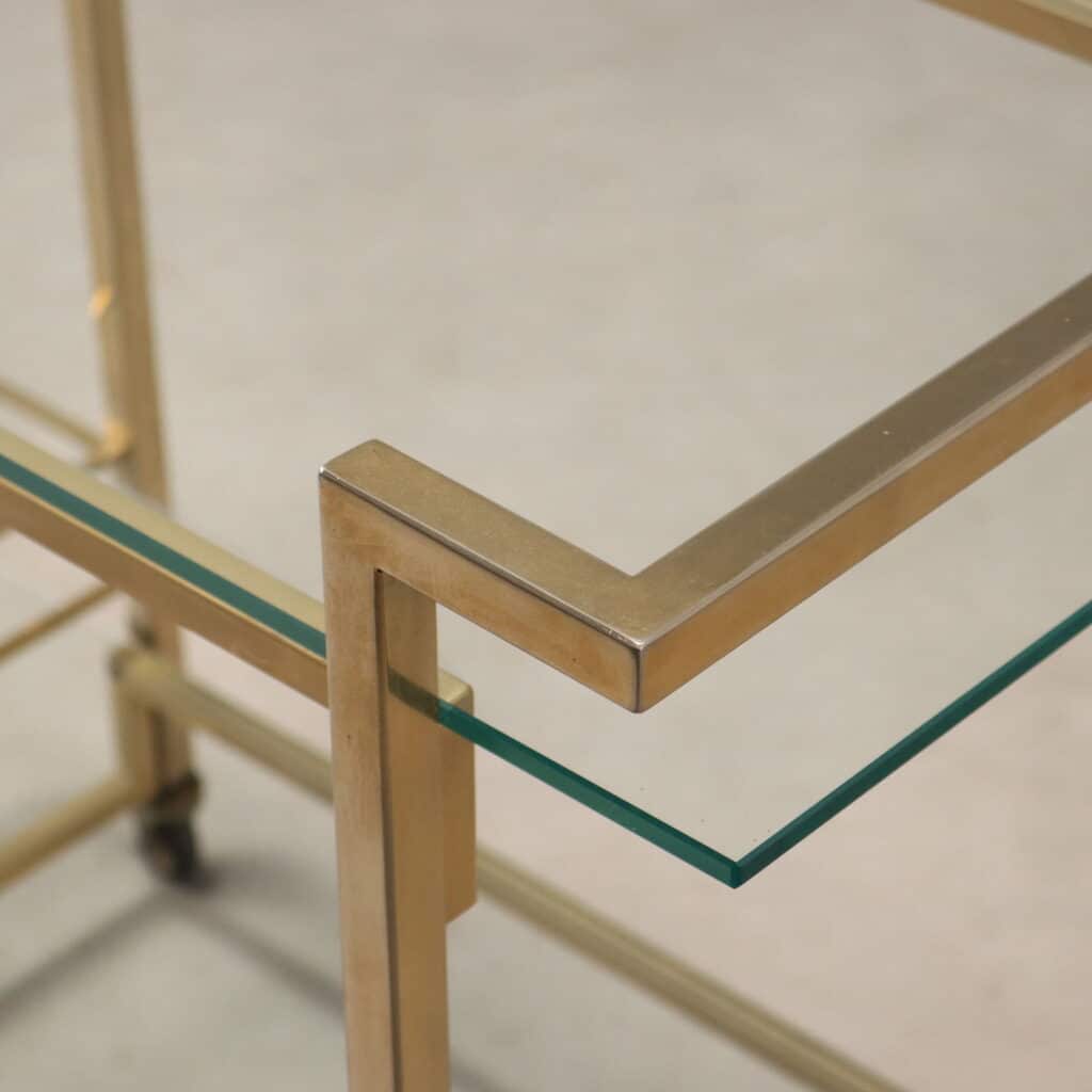Carrellino vintage anni ’70 con doppio piano e vano porta bottiglie, metallo ottonato e vetro trasparente.Codice: MOCOCO0306521