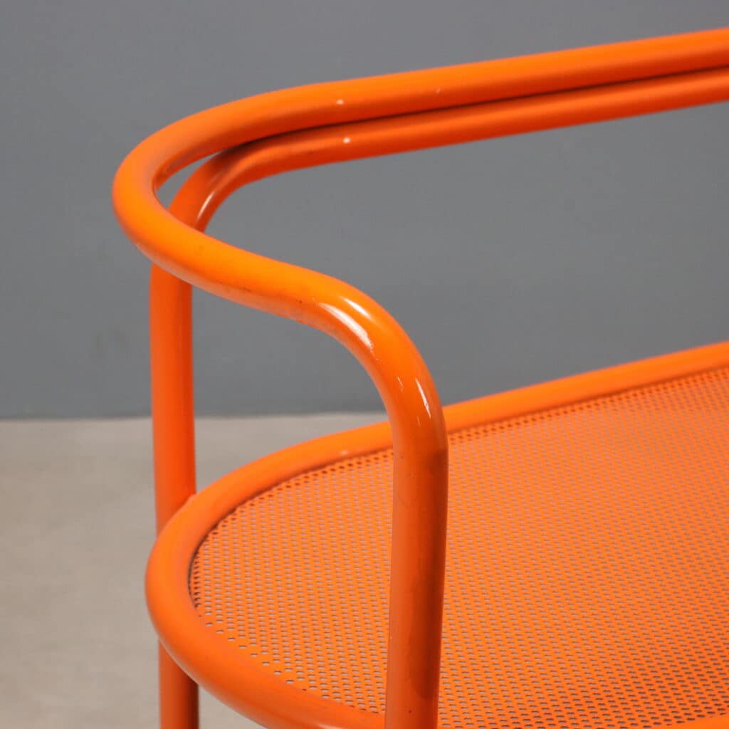 Iconico divanetto in metallo curvato e smaltato arancione modello ‘Locus Solus’ disegnata da Gae Aulenti per un produzione Poltronova.