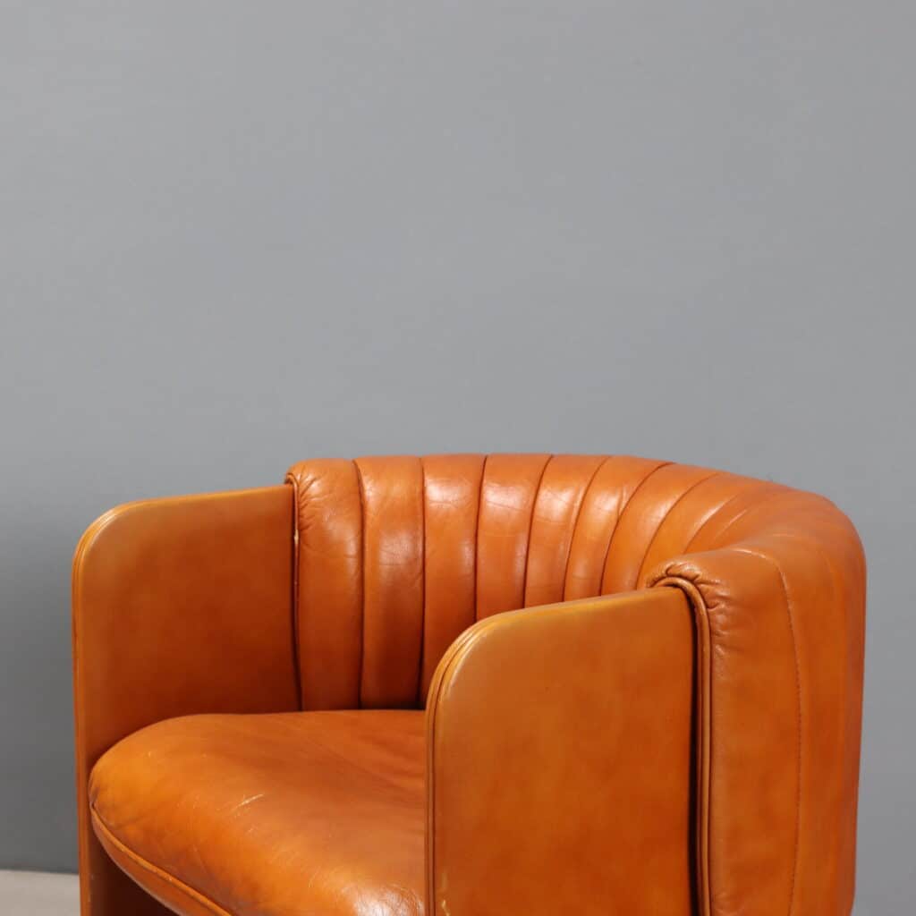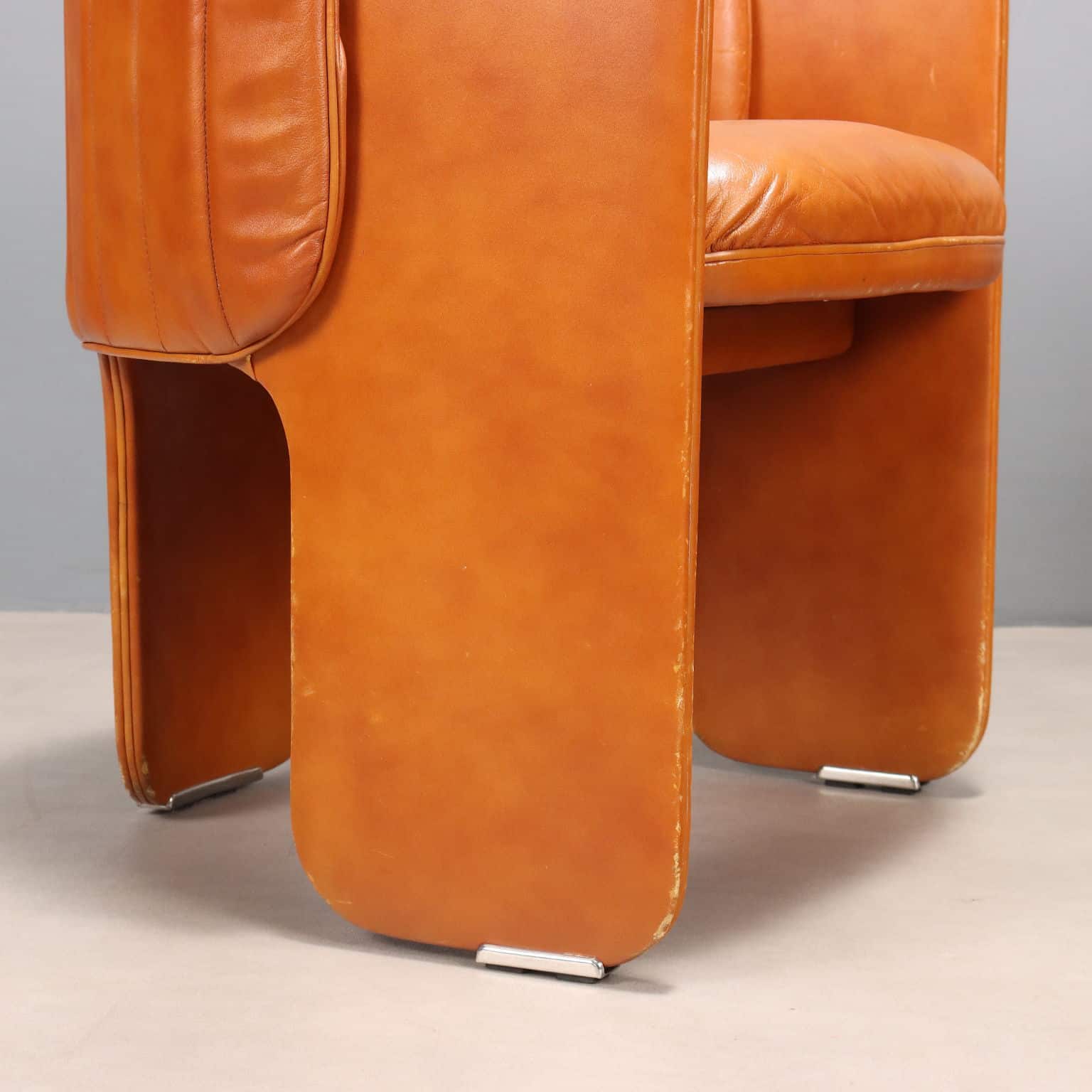 Coppia di poltroncine modello ‘Dinette’ disegnate da Luigi Massoni per una produzione Poltrona Frau anni ’70. Rivestimento in pelle color cognac.