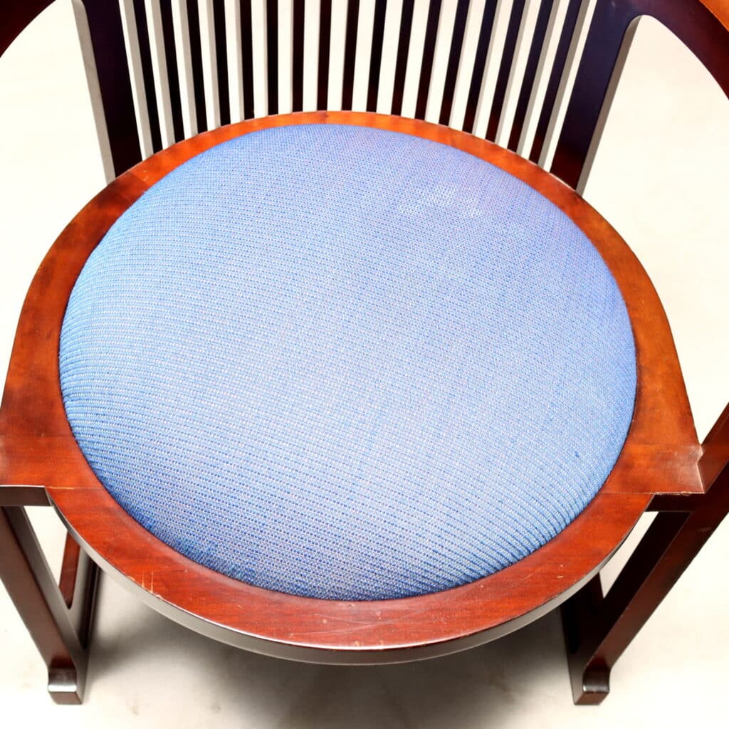 Coppia di poltroncine modello ‘Barrel’, disegnate da Frank Lloyd Wright e realizzate con struttura in legno di ciliegio a vista, prodotte da Cassina negli anni ’80.