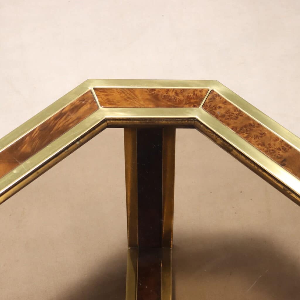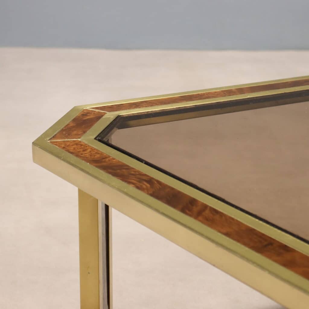 Coffee table di manifattura italiana anni ’70 con struttura in ottone e inserti in radica, piano scantonato in vetro fumè.Codice: MOTATA0308405