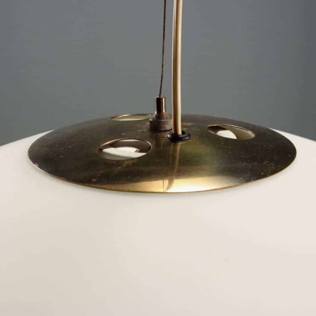 Lampada a soffitto con struttura in ottone e paralume con forma ad ufo in vetro opalino. All’interno presente il marchio della manifattura.
