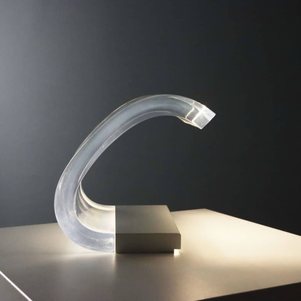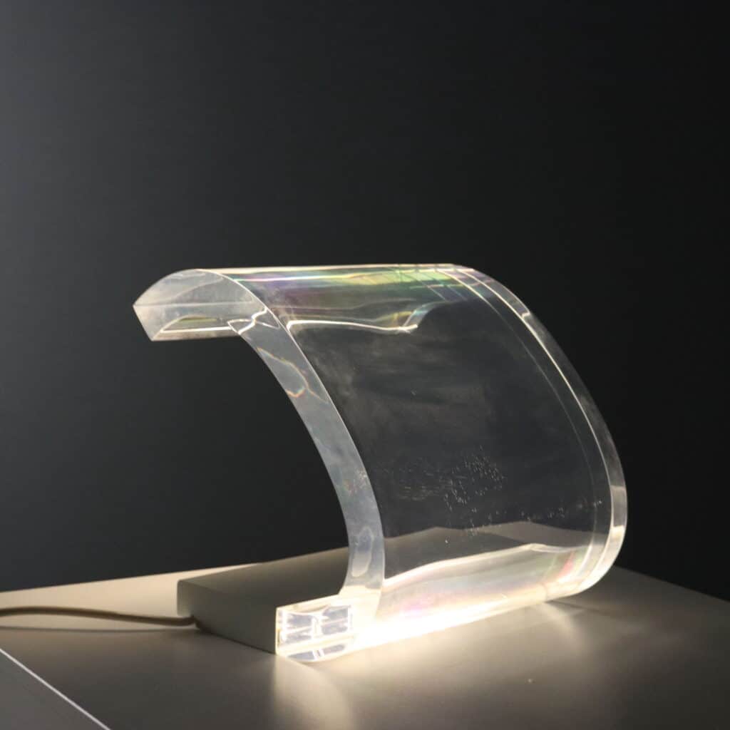 Lampada da tavolo modello ‘281’ disegnata da Gianni e Joe Colombo per una produzione Oluce anni ’60. Realizzata in metallo smaltato bianco e metacrilato trasparente, questa lampada ha vinto la medaglia d’oro alla XIII Triennale di Milano. Grazie alla curvatura e allo spessore permette alla luce della lampadina contenuta nella base d’acciaio di risalire lungo il corpo trasparente ed illuminare fino alla sommità .