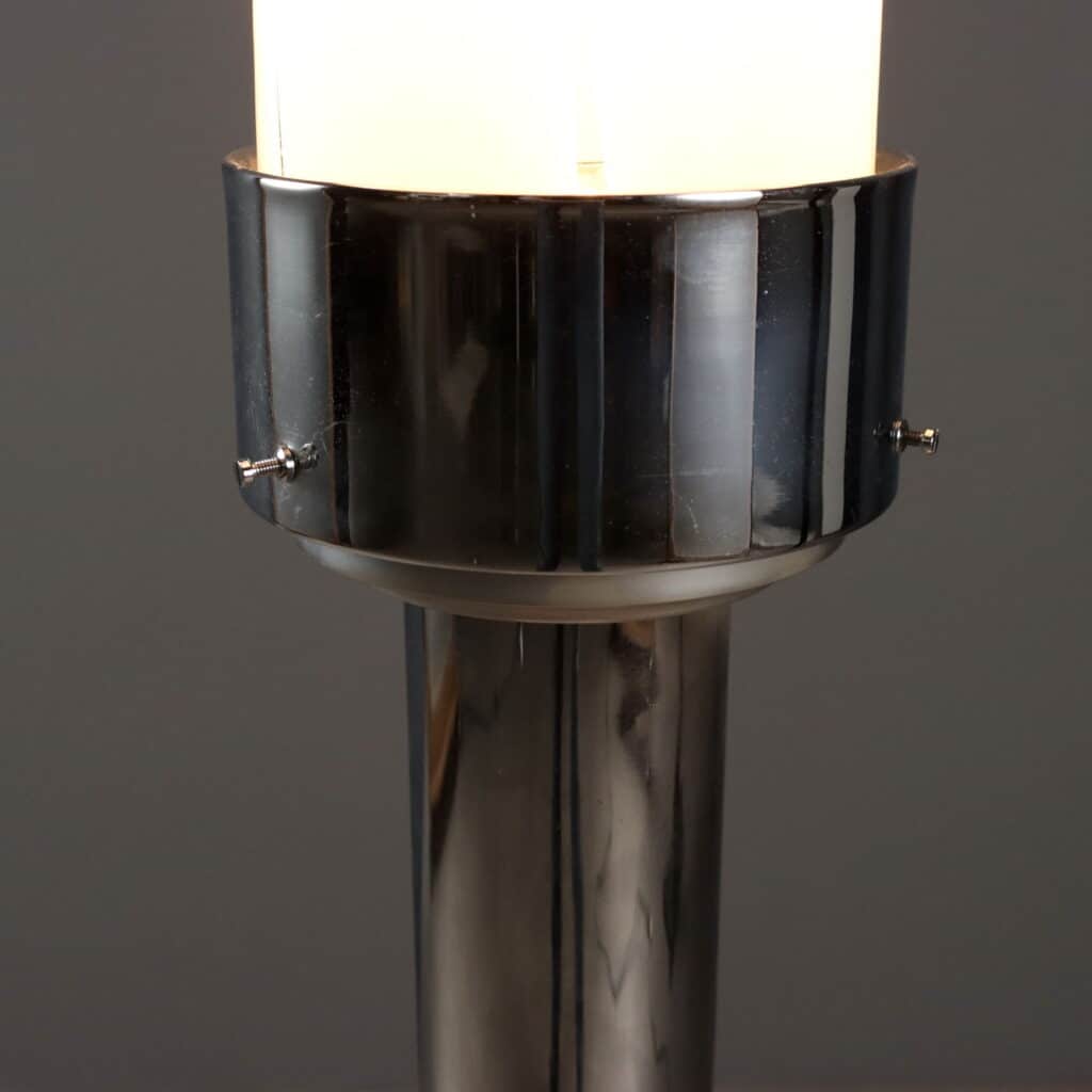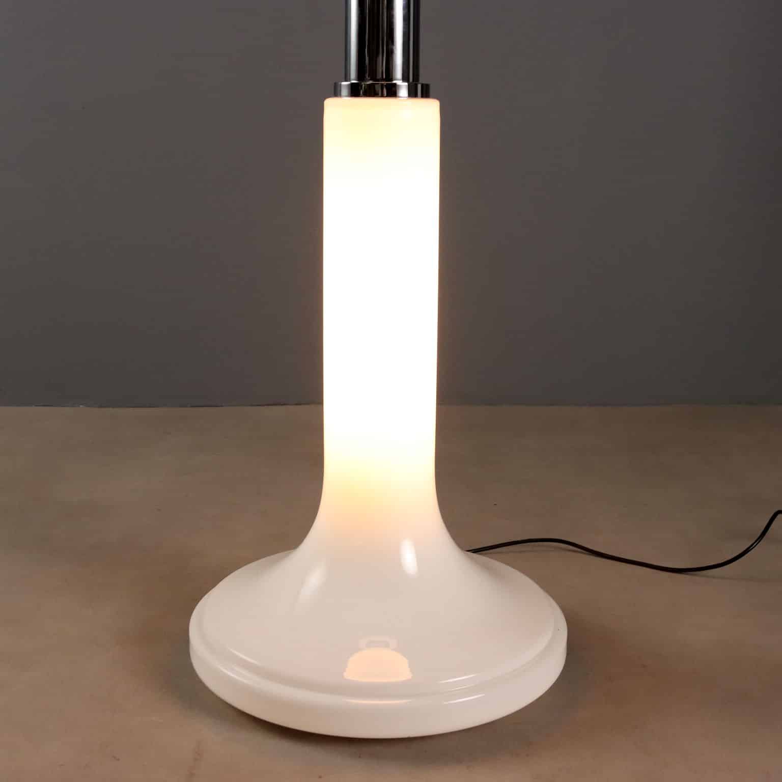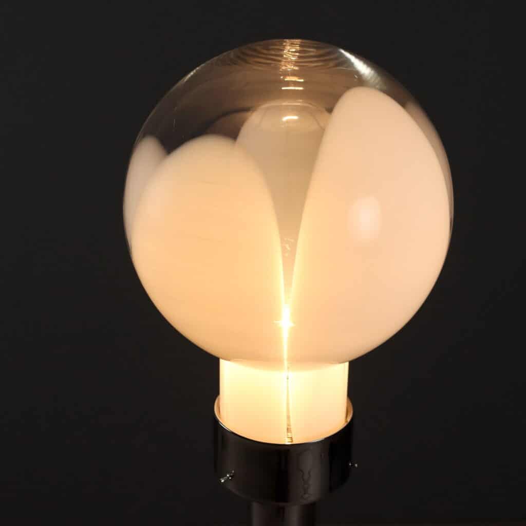 Lampada da terra anni ’70 con doppia accensione con base in metallo cromato e boccia in vetro trasparente e lattimo. Ottime condizioni.Info & dettagli qui.