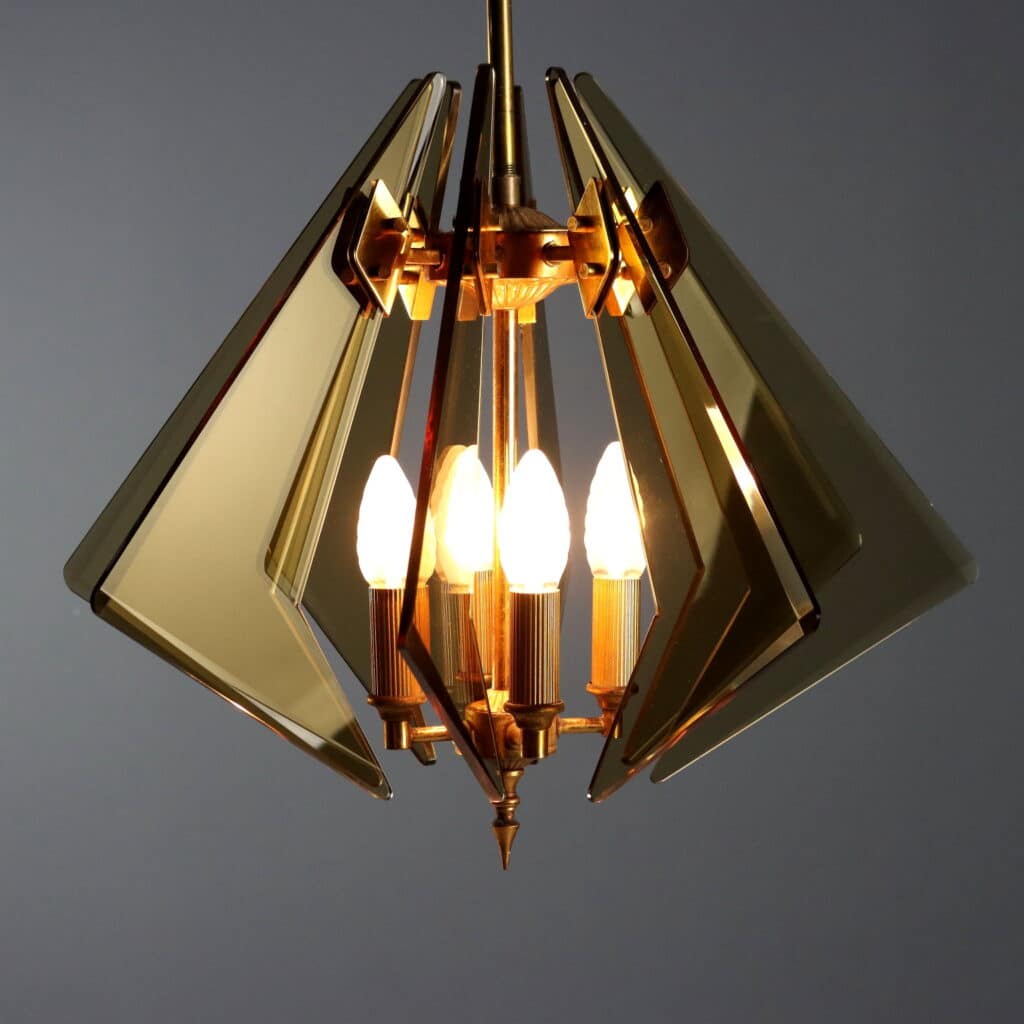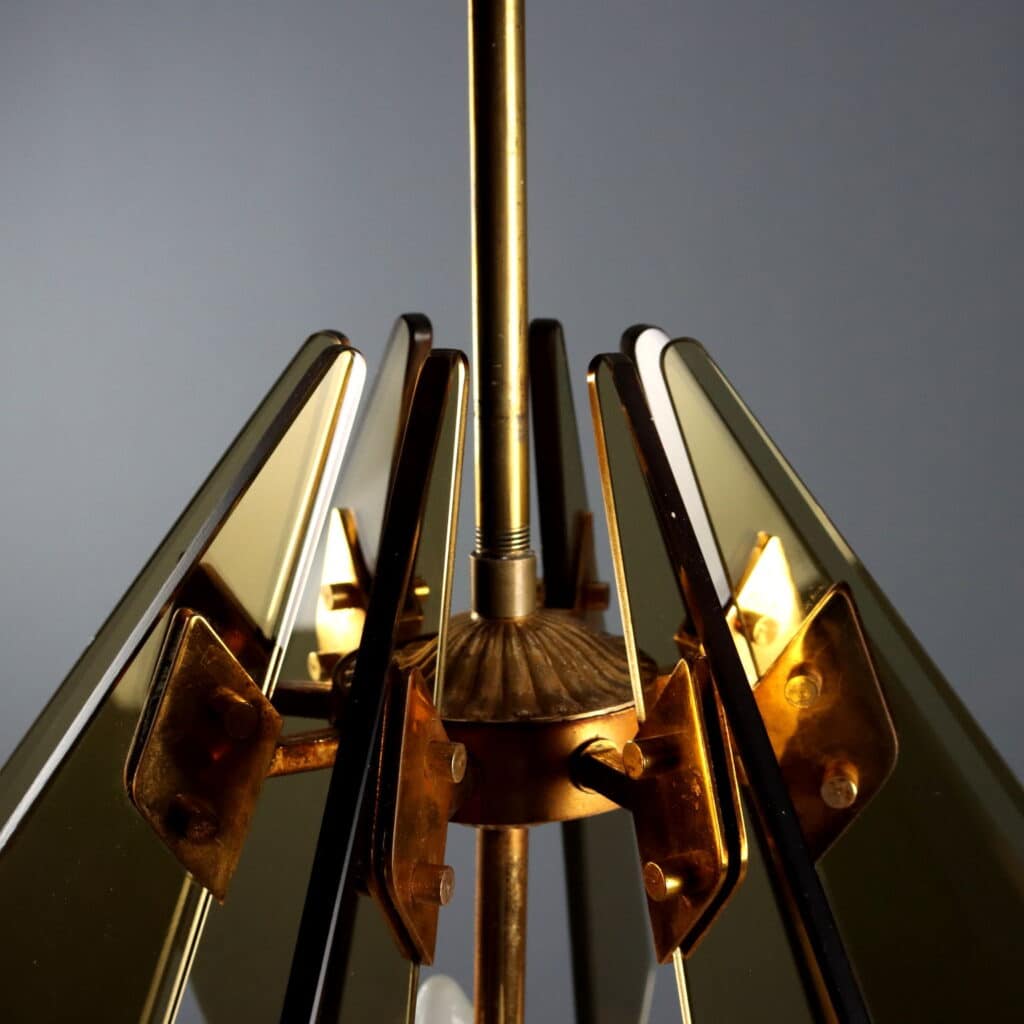 Lampada vintage da soffitto di manifattura italiana del XX secolo con struttura in ottone e vetri colorati.Info & dettagli qui.