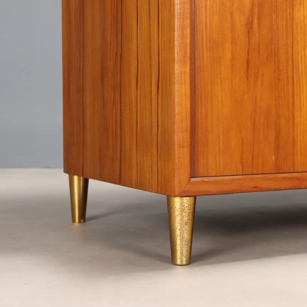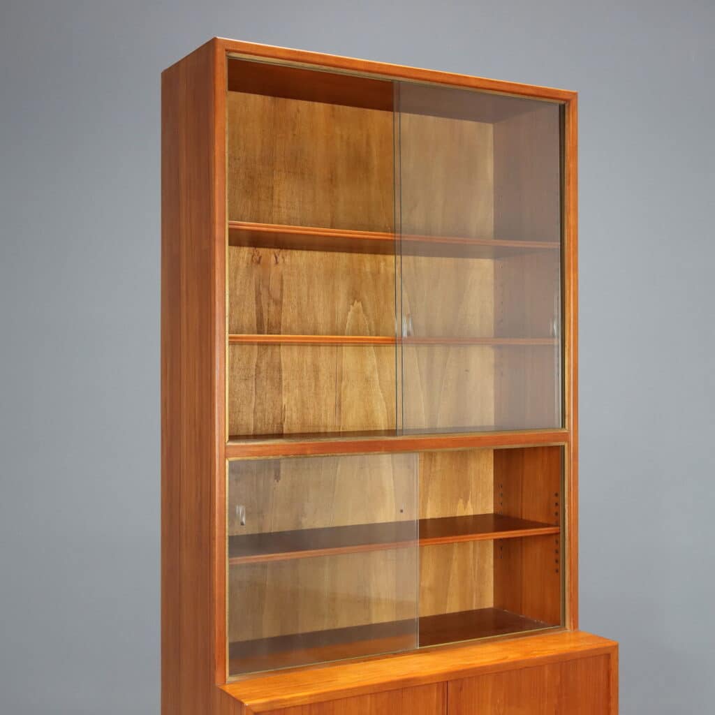 Libreria con vetrina con impiallacciatura in legno di larice, vetrina con ante scorrevoli in vetro e finitura in ottone spazzolato.