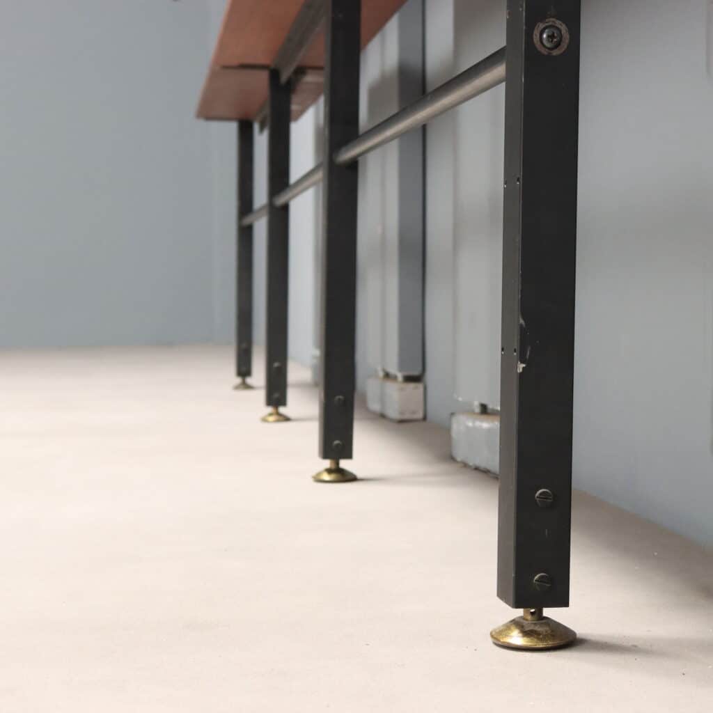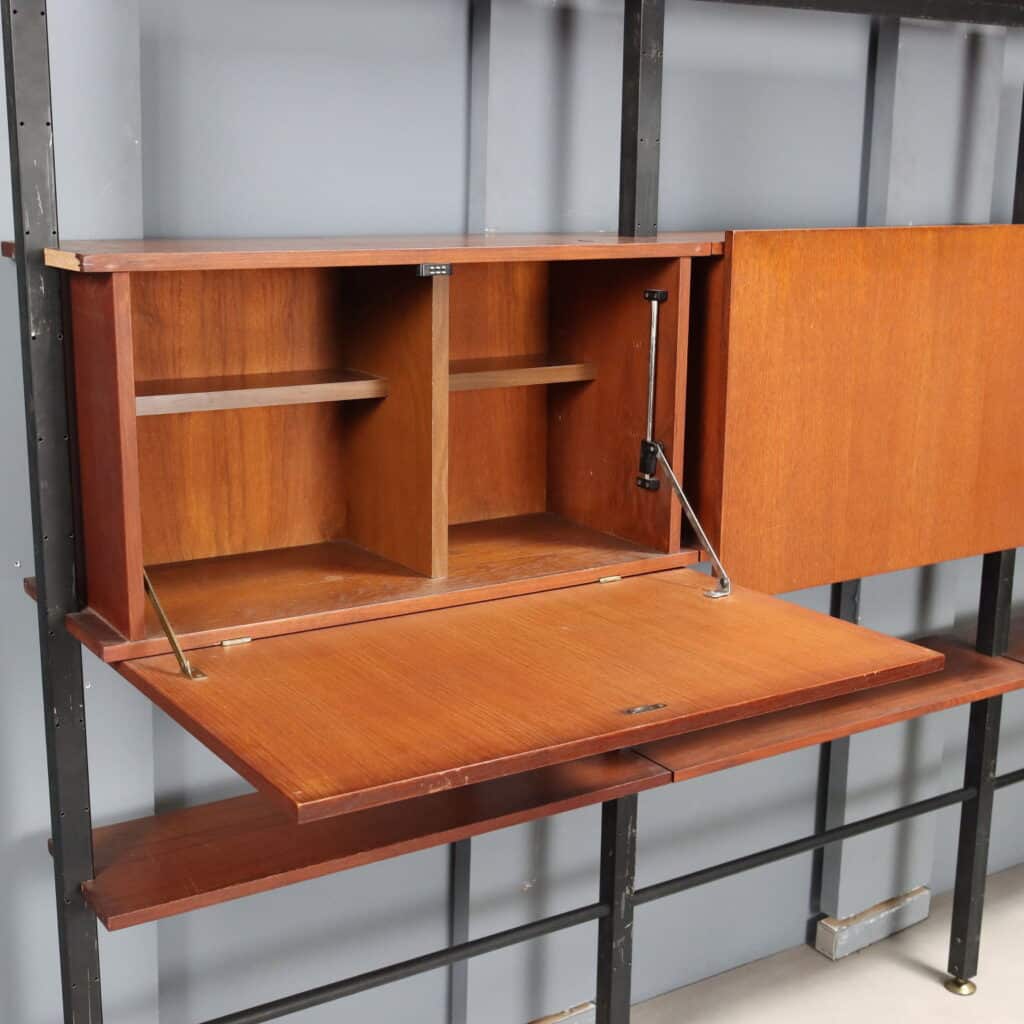 Grande libreria terracielo a tre campate con montanti in metallo laccato nero, terminali in ottone, ripiani e vani contenitori a posizione regolabile.