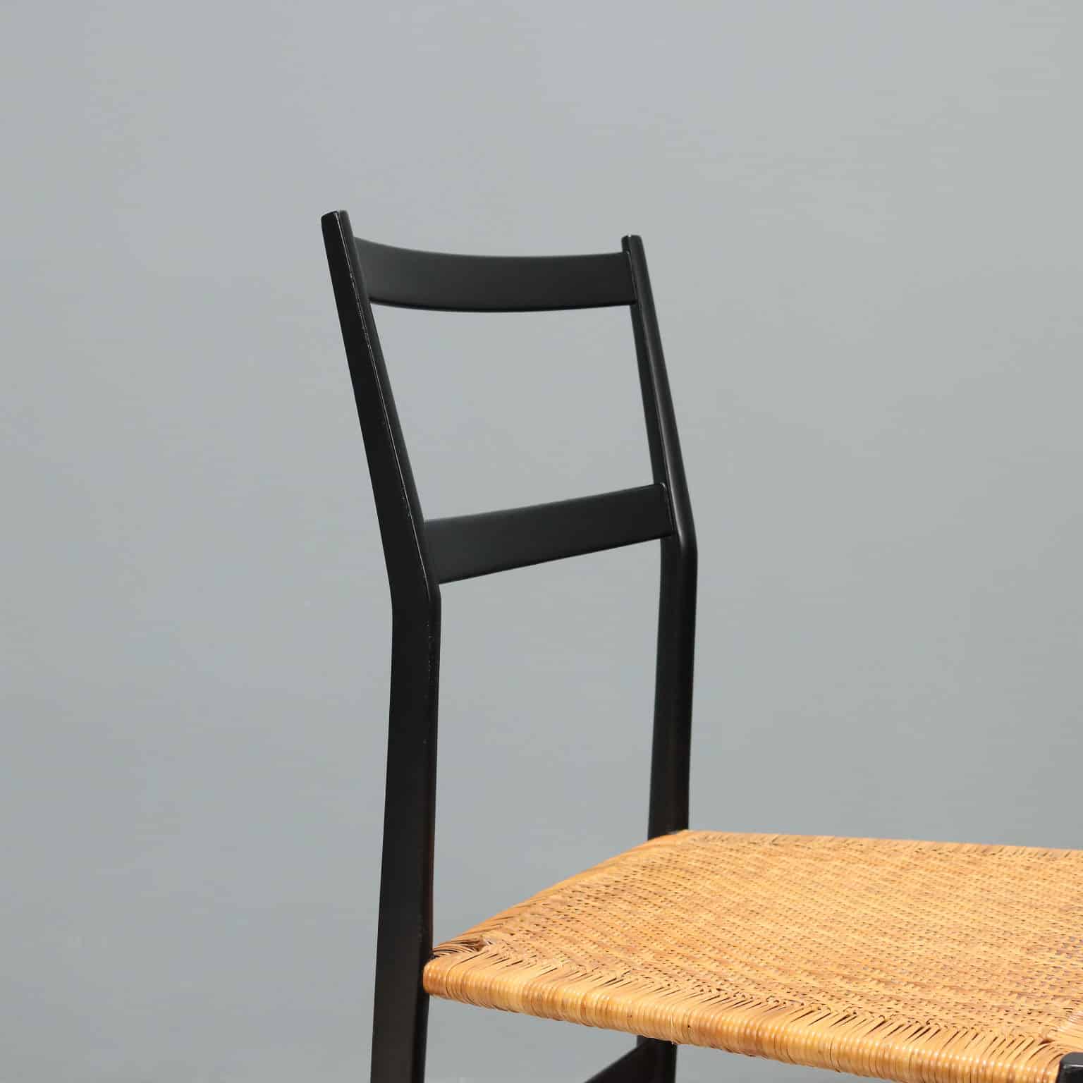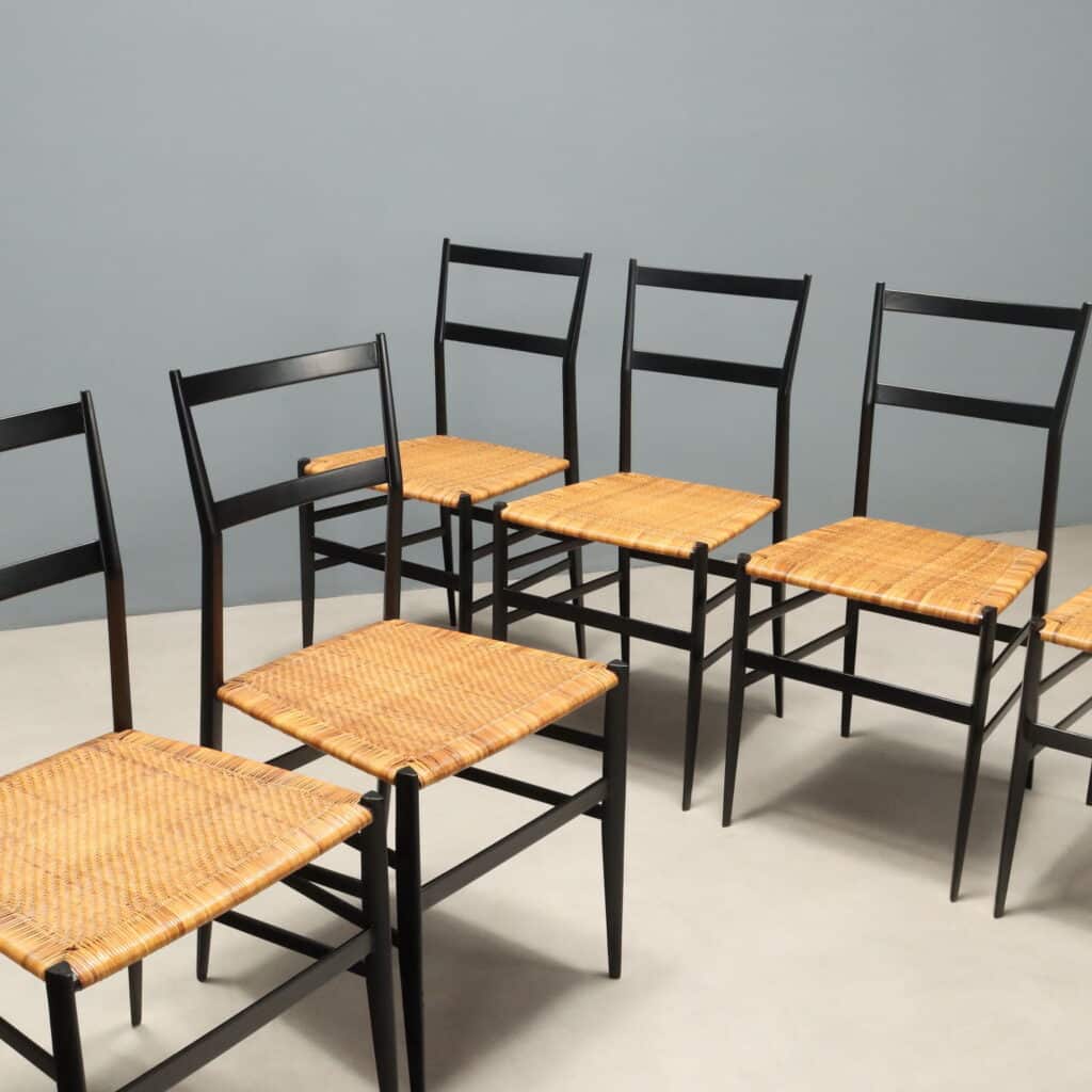 Set di sei sedie da pranzo modello ‘699 Superleggera’ disegnate da Gio Ponti per una produzione Cassina anni ’60. Struttura in legno di frassino tinto nero, seduta in canna d’India originale del periodo in ottime condizioni originali.