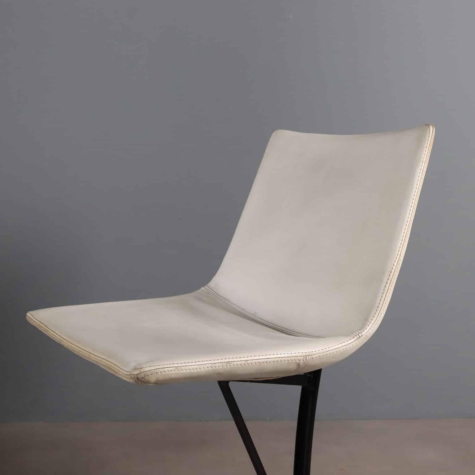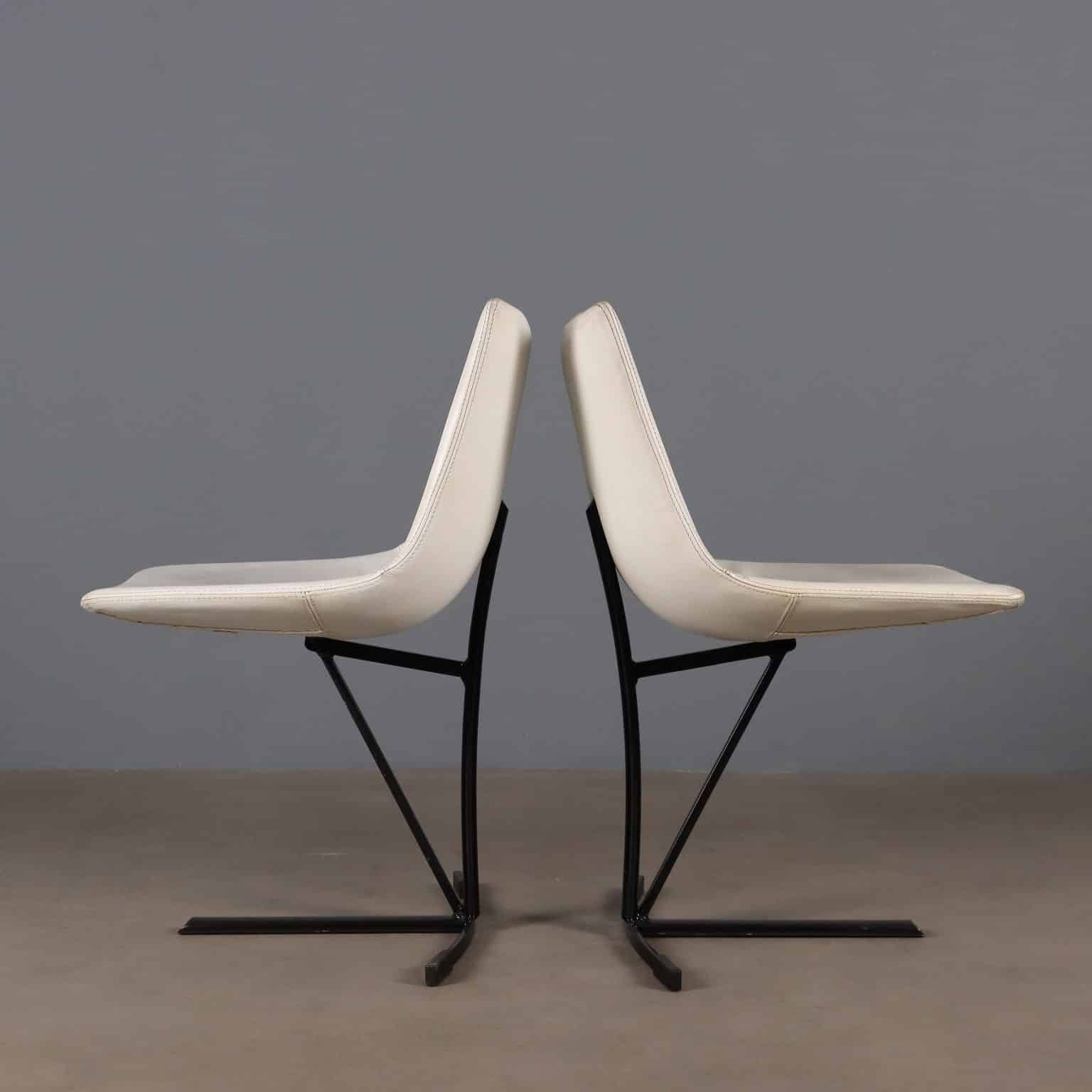 Set di cinque sedie da pranzo marca Saporiti Italia con struttura in metallo smaltato nero, seduta e schienale con rivestimento in similpelle bianca.