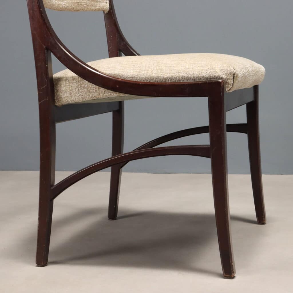 Sei sedie da pranzo anni ’60 con struttura in legno a vista, seduta e schienale con tessuto originale nei toni del panna.Codice: MOSESE0295041