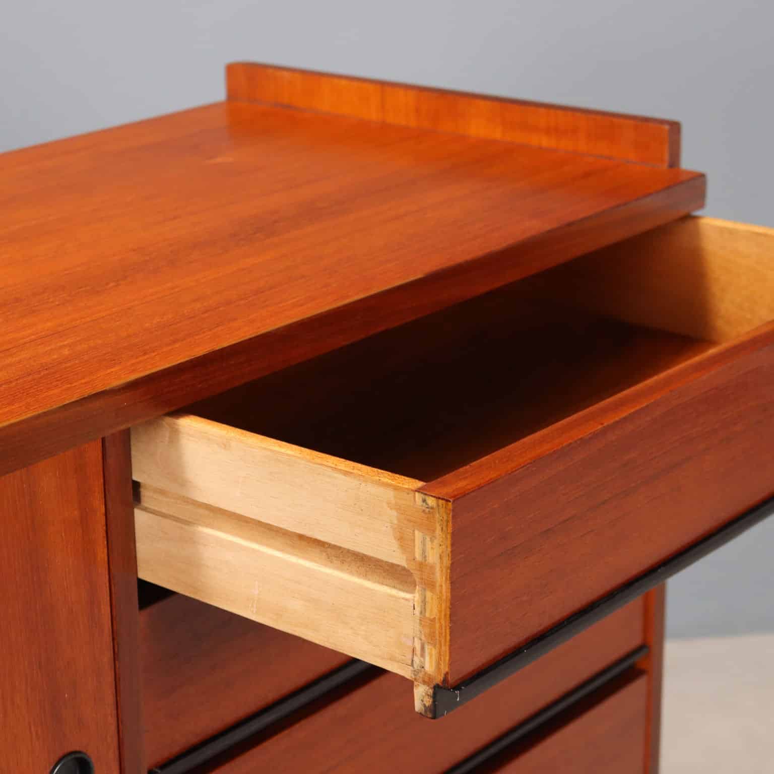 Sideboard vintage di manifattura italiana realizzato in legno di teak e perfettamente restaurato nei nostri laboratori con ante a scorrimento e quattro cassetti con maniglia in metallo laccato nero.