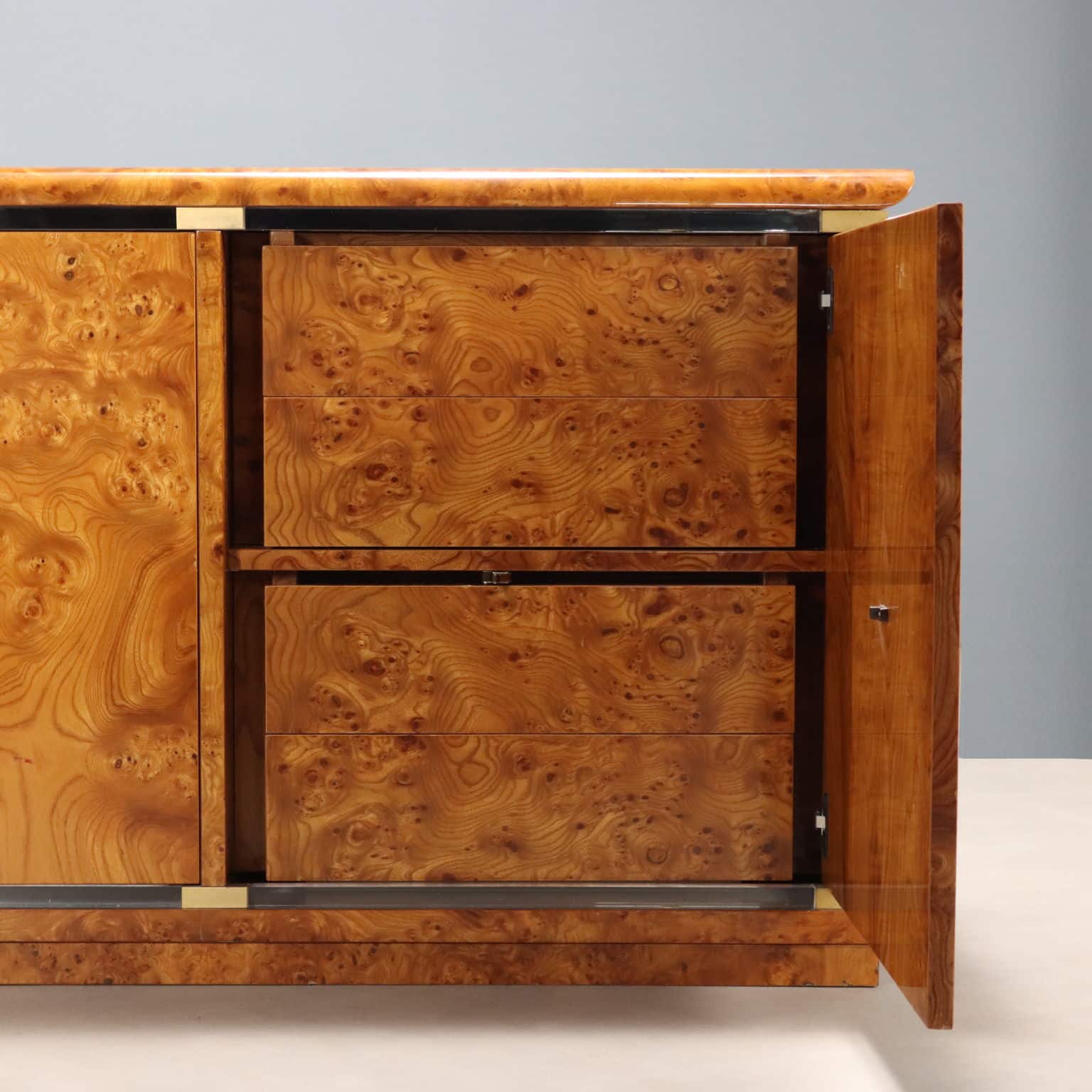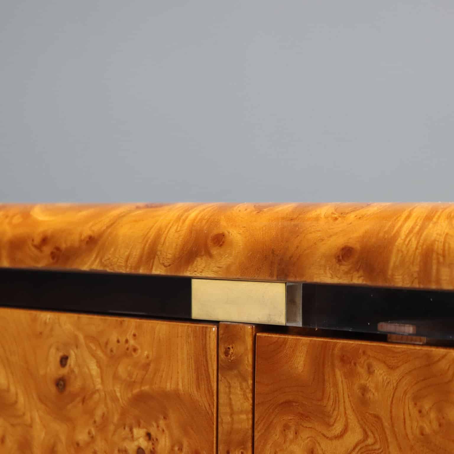 Elegante sideboard da centro in radica di noce con inserti in ottone e ante a battente.Di manifattura italiana, il mobile si presenta in perfette condizioni.Codice: MOMOMO0297317