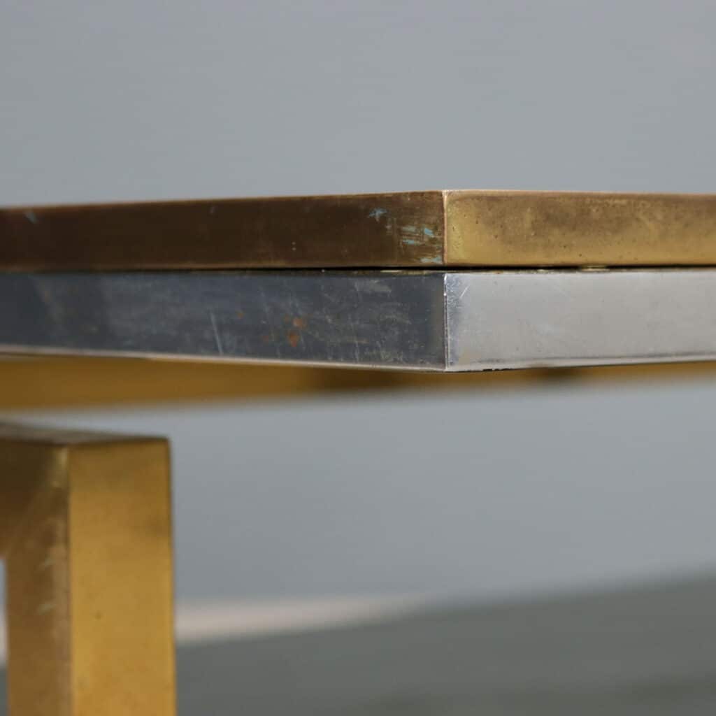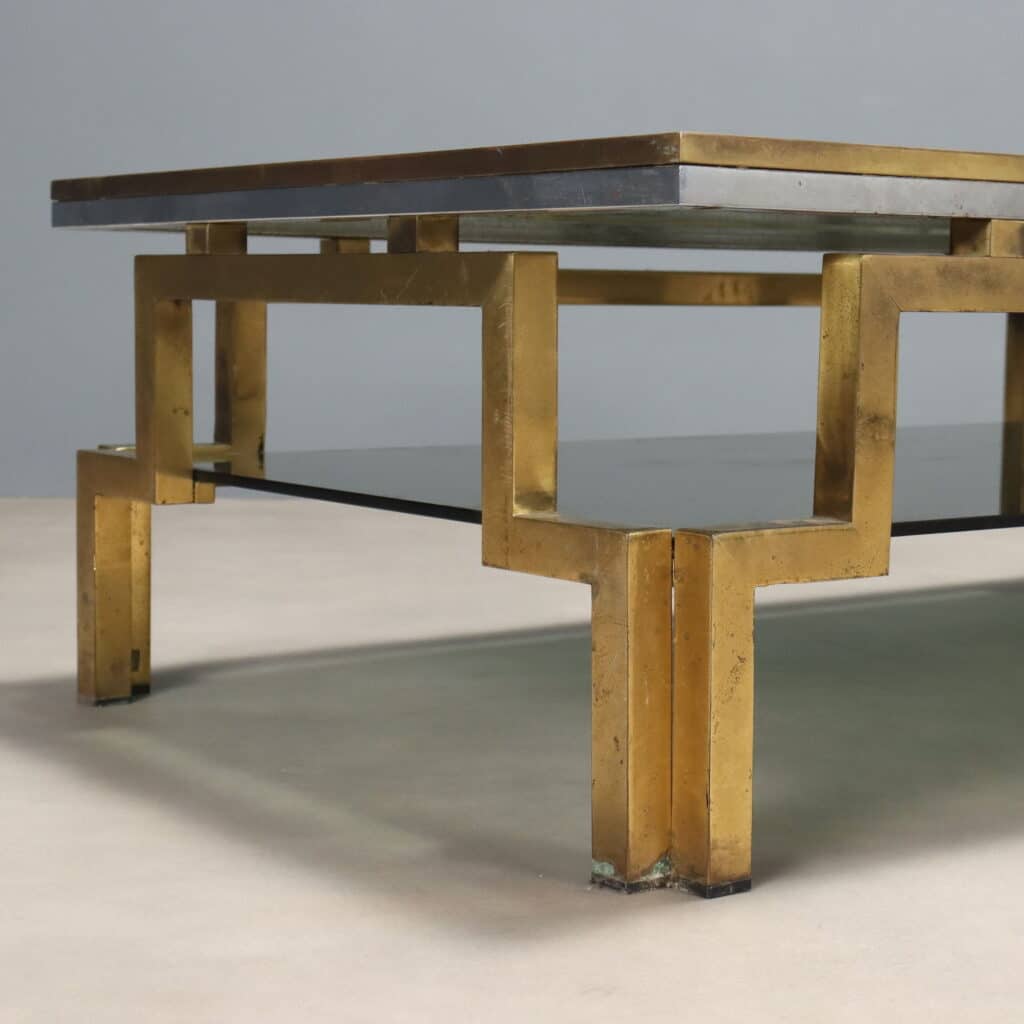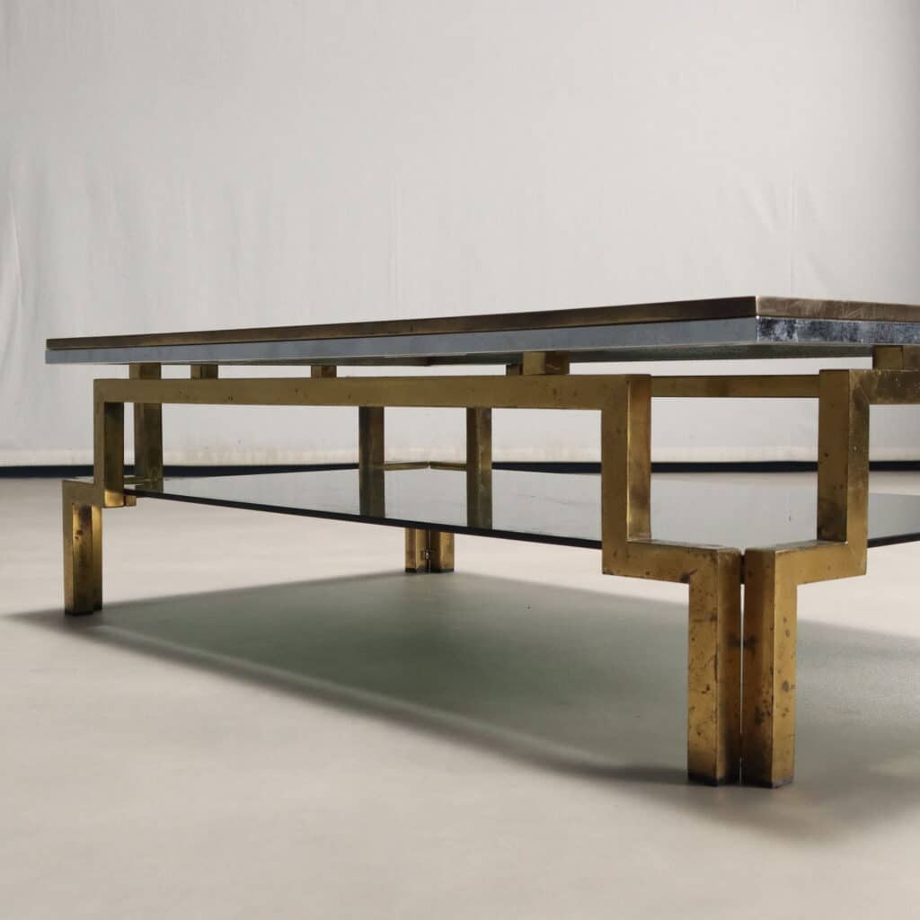 Tavolino vintage di manifattura italiana anni ’60 con struttura in metallo e ottone, doppio piano in vetro fumè.Info & dettagli qui.