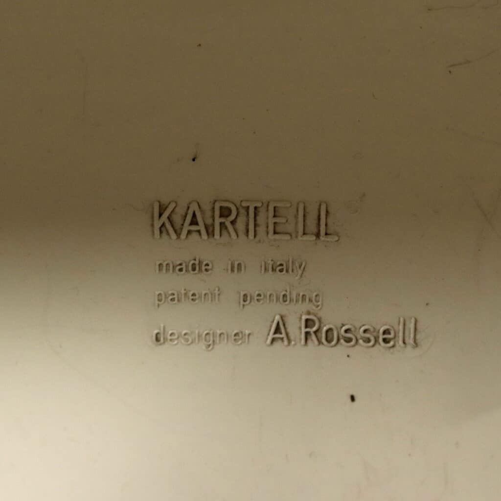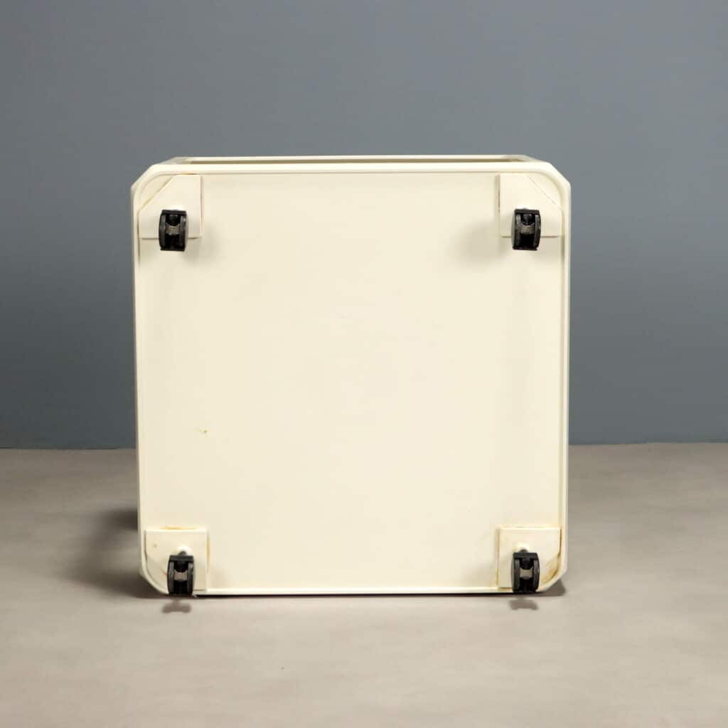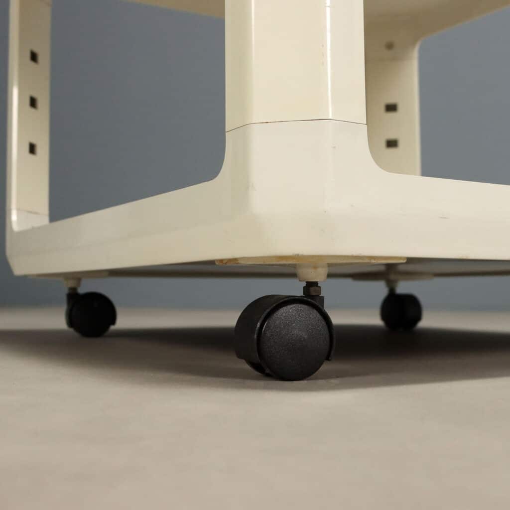 Tavolino vintage in materiale plastico bianco con rotelle disegnato da Alberto Rosselli per una produzione Kartell anni ’60.