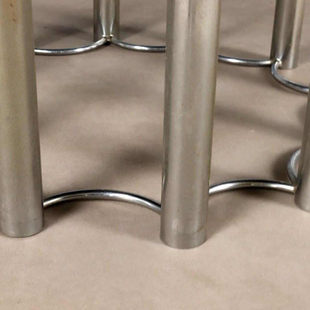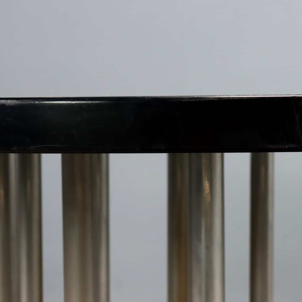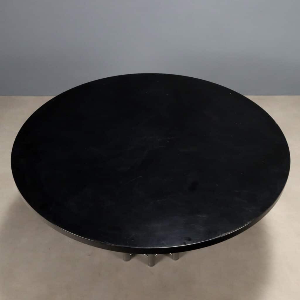 Tavolo vintage di manifattura italiana anni ’60 con base in metallo cromato e piano tondo in legno laccato nero.