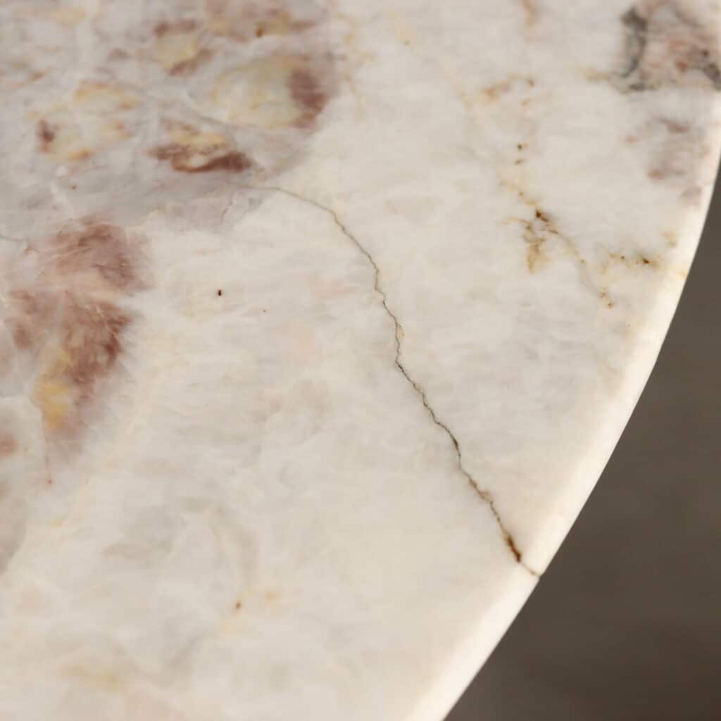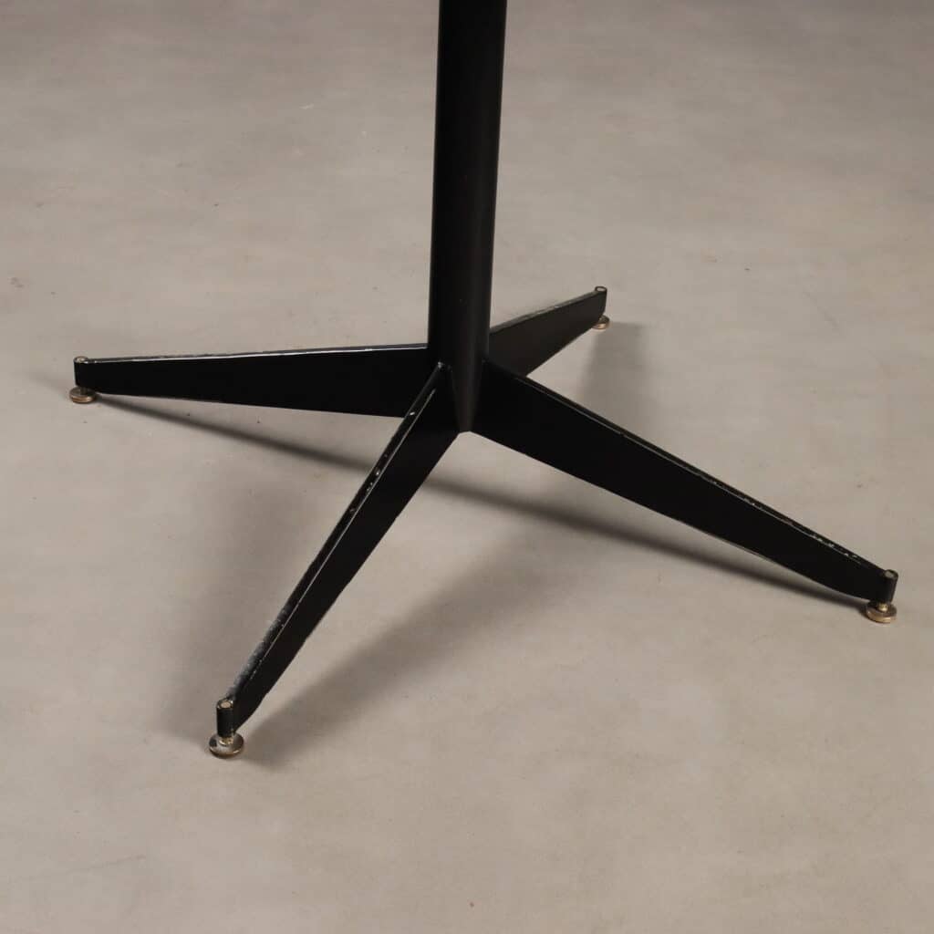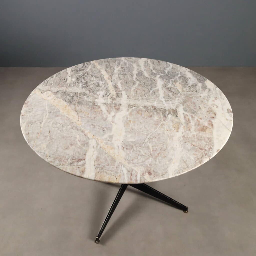 Elegante tavolo da pranzo di manifattura italiana anni ’60 con piano tondo in marmo, gambe in metallo smaltato nero e piedini in ottone.Codice: MOTATA0298990