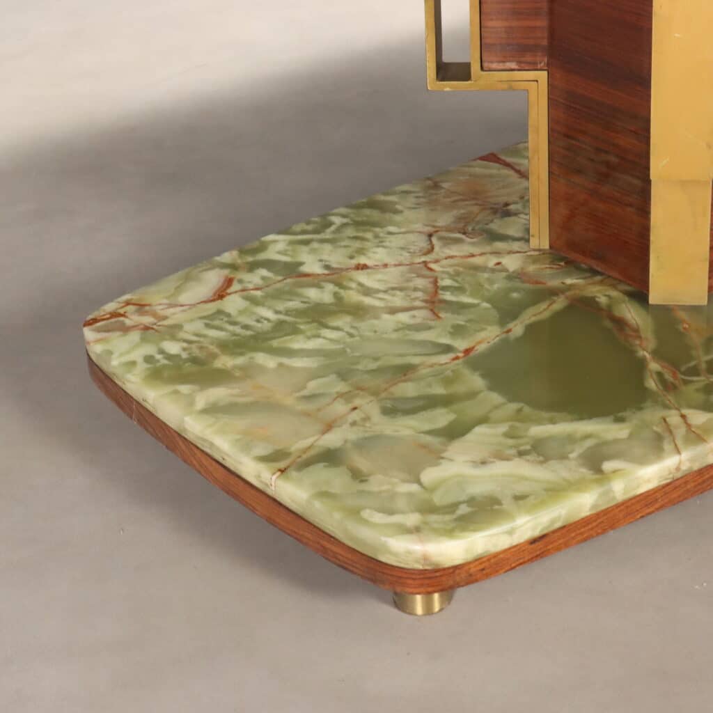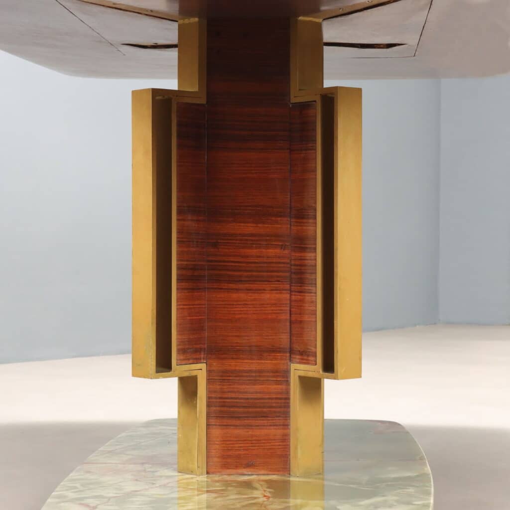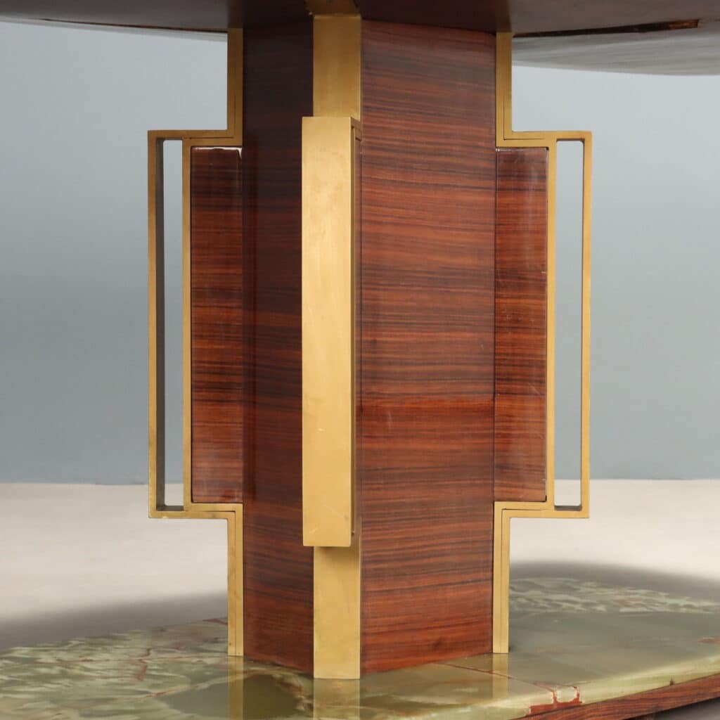Elegante tavolo da pranzo anni ’60 con importante piano in onice e struttura in legno con inserti in metallo ottonato.Restaurato nei nostri laboratori.Codice: MOTATA0293173